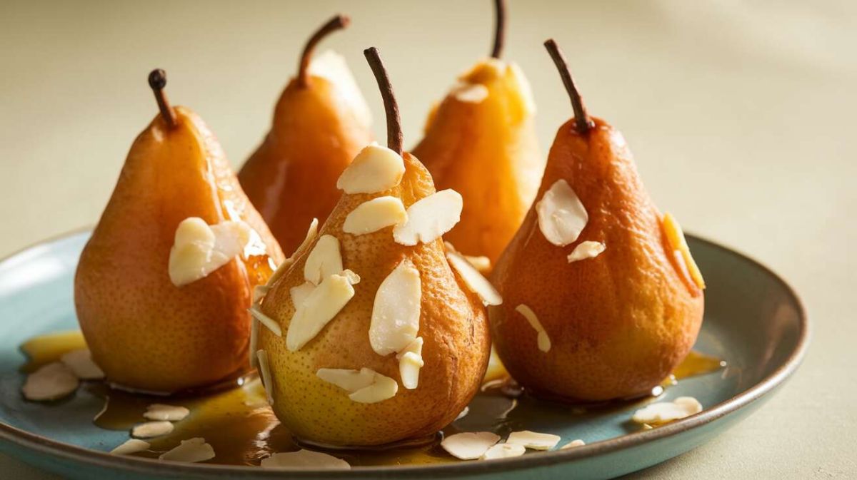 Lorsque les poires sont prêtes, laissez-les refroidir légèrement avant de les parsemer d’amandes grillées.