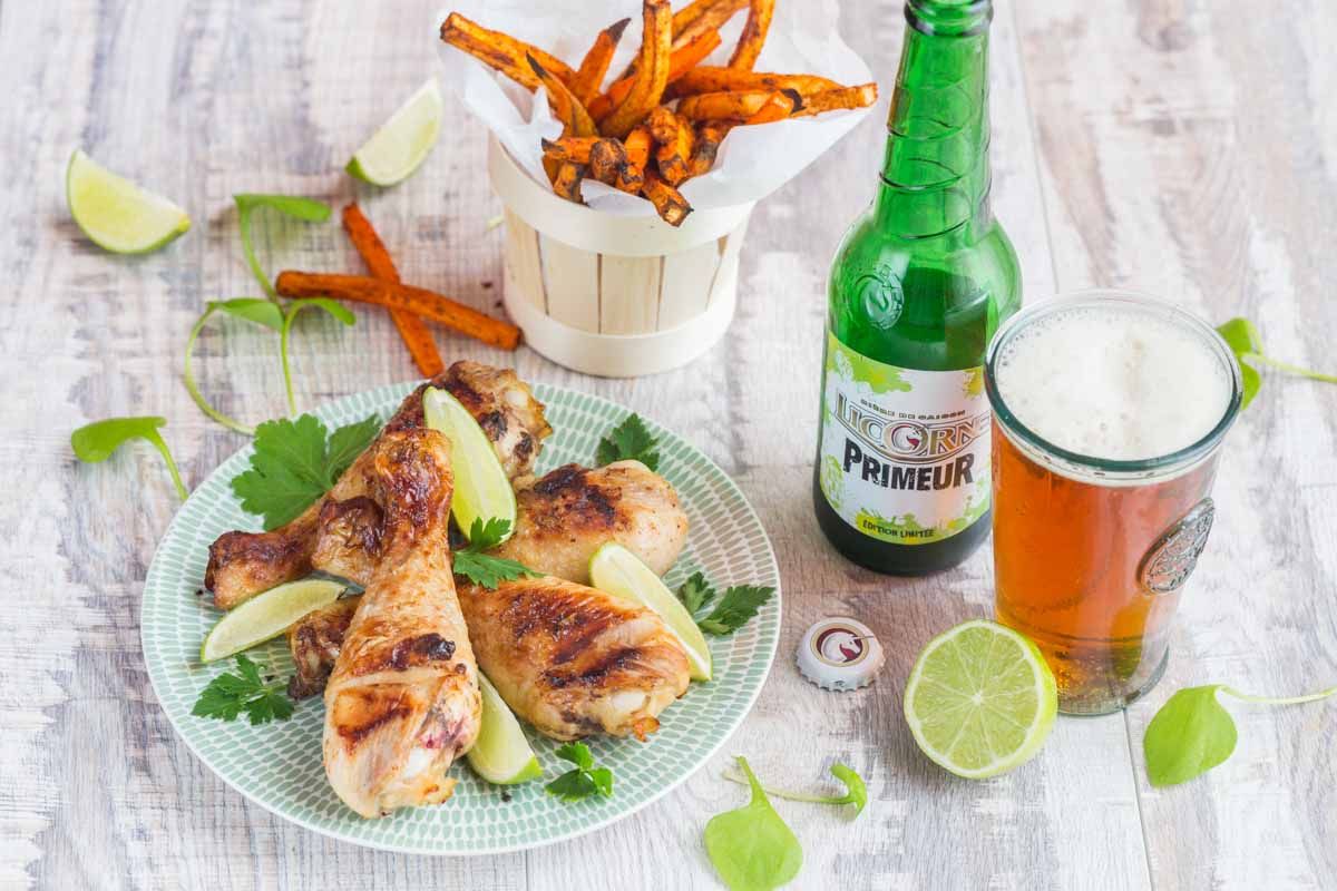 Pour commencer, voici une recette à base de Licorne Primeur, une bière ambrée aux arômes puissants et aux notes fruitées. Cette bière, parfaite pour mariner des pilons de poulet, se marie idéalement avec le citron vert, créant une harmonie de saveurs parfaite pour vos barbecues d'été. En accompagnement, je vous propose des frites de légumes à base de carottes, panais et patate douce.