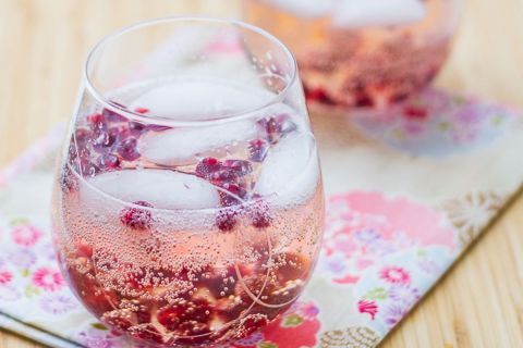 - Dans chaque verre, ajoutez de la glace et environ une cuillère à soupe de graines de grenade, puis remplissez à mi-hauteur avec le mélange au rosé et complétez avec de l'eau gazeuse.