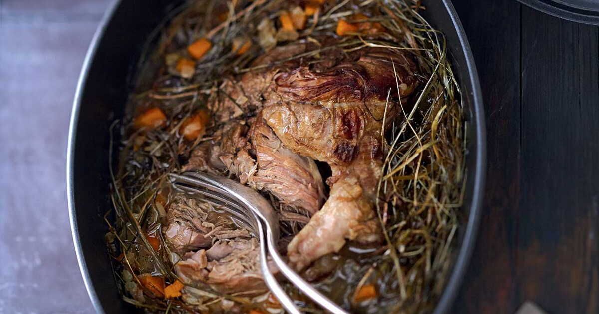 Commencez par assaisonner l'épaule d'agneau avec du sel, du poivre et des herbes. Saisissez-la dans une cocotte pour lui apporter une belle coloration. Ajoutez ensuite l'ail et le bouillon, puis disposez le foin sur la viande avant de couvrir. Laissez mijoter doucement pour que les saveurs s'imprègnent mutuellement.