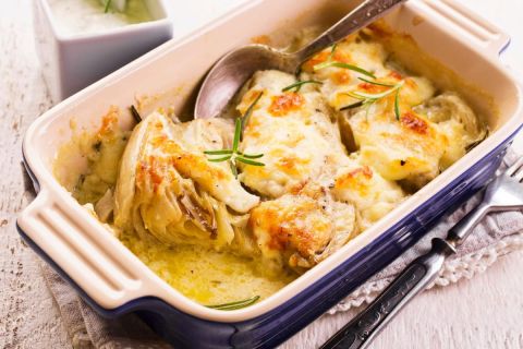 - Dans un plat à gratin, disposez les endives, recouvrez avec la béchamel, puis ajoutez les tranches de fromage à raclette. Enfournez pour 20 minutes à 200 °C, jusqu'à ce que le gratin soit doré.