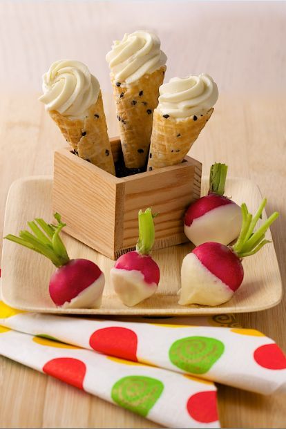 7) Lavez et séchez soigneusement les radis. Trempez la base de chaque radis dans la crème fondue.