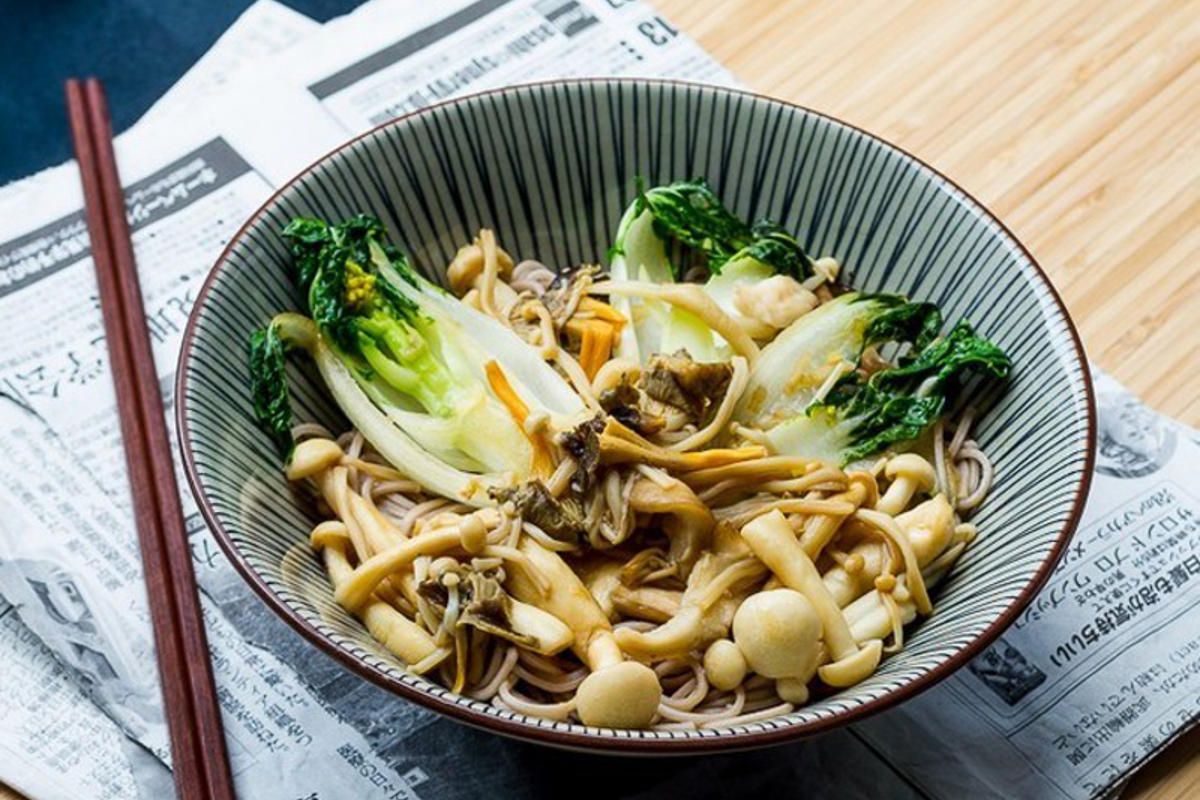 - Poursuivez la cuisson jusqu'à ce que les pak choï soient tendres, ajoutez les champignons, le vinaigre de riz et la sauce soja. Enfin, incorporez l'oignon nouveau et les nouilles soba, et faites sauter le tout deux minutes avant de servir.