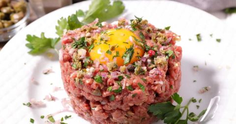 - Dressage : Formez une belle boule avec la viande sur une assiette et faites un creux au centre pour y déposer le jaune d'œuf. Entourez le plat des ingrédients optionnels pour encore plus de saveurs.
