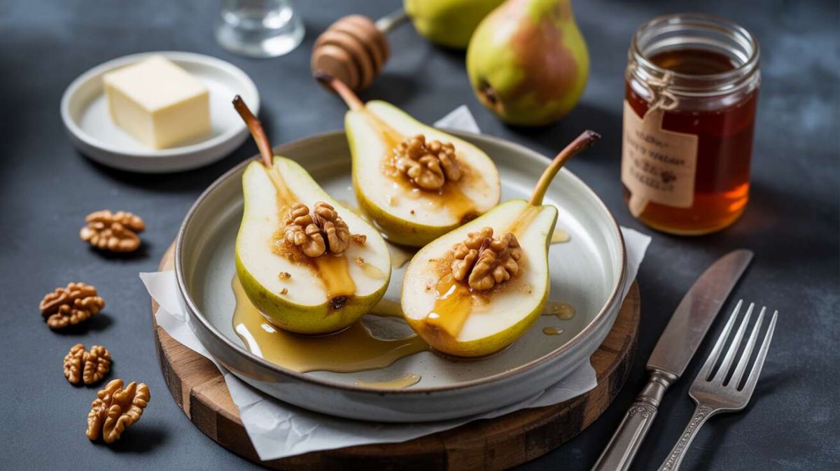 Dans un bol, mélangez le miel avec le fromage bleu émietté jusqu'à obtenir une consistance crémeuse. Versez ce mélange sur les poires en veillant à bien les recouvrir. Pour ajouter du croquant et de la saveur, parsemez le tout de noix concassées.