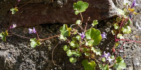 La cymbalaire des murs (Cymbalaria muralis), surnommée ruine-de-Rome, est une plante vivace et rustique, pouvant résister à des températures allant jusqu'à -20°C. Originaire des roches du bassin méditerranéen, notamment en Italie, elle est souvent observée sur les murs anciens, témoignant de l'architecture d'antan, comme l'indique Vincent Albouy dans son ouvrage Flore des villes*.