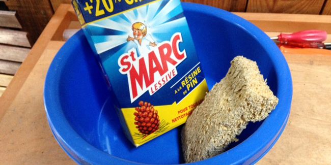 - Les cristaux de soude : Mélangez deux cuillères à soupe dans un seau d’eau chaude.