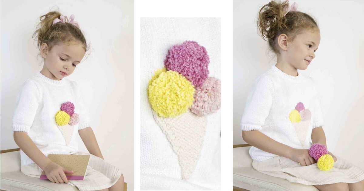 Le design de ce pull met en avant un cornet de glace en pompons, que vous pouvez choisir de tricoter séparément puis coudre ou intégrer directement en jacquard sur le devant du modèle. Cela offre une flexibilité à chaque créateur, tout en maintenant un aspect joyeux et ludique.
